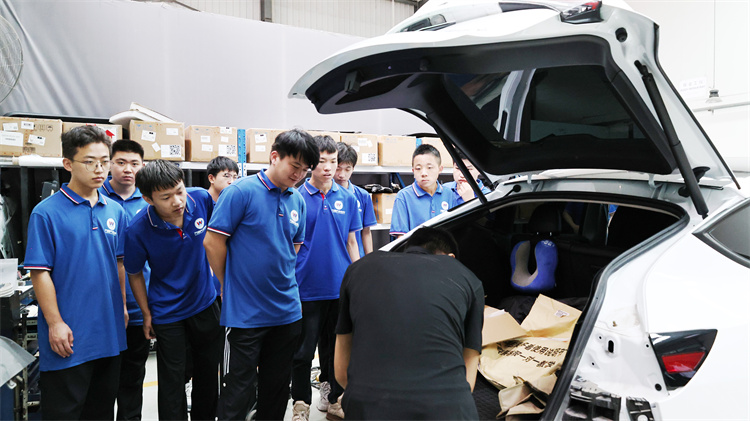2.沉浸研學觸摸標準:車間實戰練真知 校園課堂的余溫未散,恒泰特斯拉(西安店)的接駁車便駛入校園,迎接新一屆學子前往恒泰集團西安總部基地開展深度研學。在班主任湯老師與創就業中心賀老師的帶領下,學生們深入企業一線。在恒泰特斯拉交付中心,門店負責人親自示范嚴謹的PDI(出廠前檢查)流程。通過這種深度場景化教學,學生在真實的工位環境中,深刻理解了“特斯拉標準”的嚴苛要求,親身感受著職業脈搏的跳動。