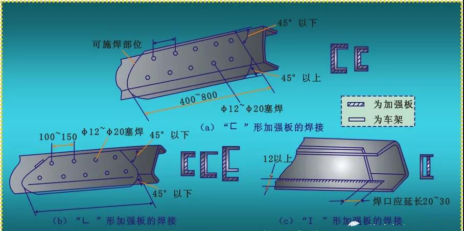 步驟3:加強板與車架的焊接主要反映在腹板上。除了塞焊以外,加強板腹板的兩端也要分段施焊,一般禁止在車架翼面板上施焊。