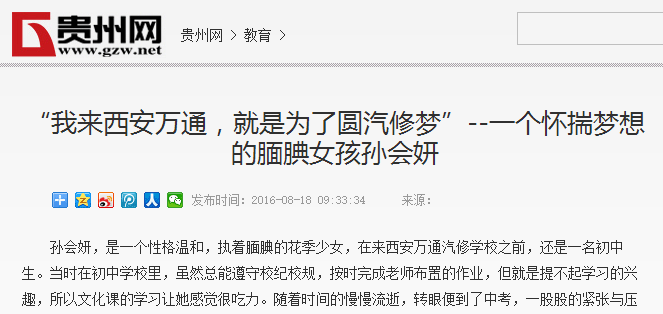 接下來,孫會妍就開始多方面途徑的查找信息。最終,孫會妍選擇了汽修類專業,這讓她爸媽很是不解,對她說,一個女娃學這專業不合適。但孫會妍并沒有因為爸媽的質疑而動搖自己的決心,因為她查閱專業信息的時候也看到有不少從事汽修類工作的女性,她堅信自己也可以。
