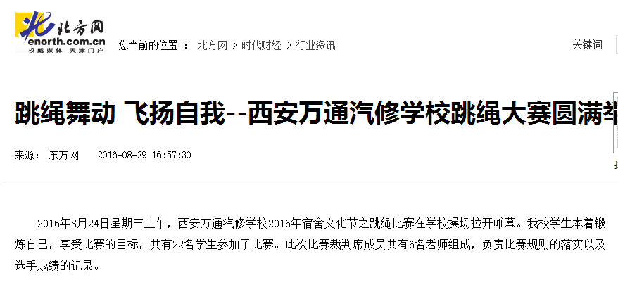 2016年8月24日星期三上午,西安萬通汽修學(xué)校2016年宿舍文化節(jié)之跳繩比賽在學(xué)校操場拉開帷幕。我校學(xué)生本著鍛煉自己,享受比賽的目標(biāo),共有22名學(xué)生參加了比賽。此次比賽裁判席成員共有6名老師組成,負(fù)責(zé)比賽規(guī)則的落實(shí)以及選手成績的記錄。