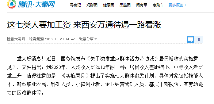【大秦網(wǎng)】這七類人要加工資 來西安萬通待遇一路看漲
