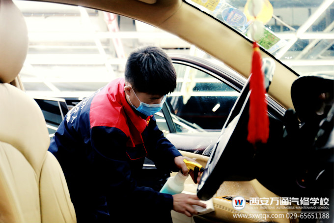 畢業之后,肖楊樂在學校的招聘會上選擇了上海的一家汽車服務公司,他告訴我們當初就是想去遠方看看。在上海這家公司從事4個月的汽車美容后,由于家里的原因肖楊樂又回到了離家近的西安,在西安萬通創就業指導中心的推薦下來到了現在的公司,有著之前在學校的良好教育以及在上海數月的工作經驗,很快就被看作中心的中堅力量來培養,現在的肖楊樂對拋光打蠟、內飾裝潢等技術都已精煉掌握。