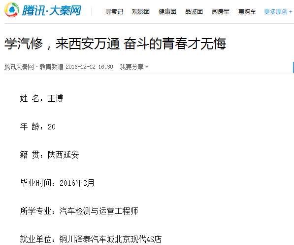 不積跬步,無以至千里;不積小流,無以成江海。王博從一個(gè)零基礎(chǔ)的高中生,在西安萬通汽修學(xué)校的兩年時(shí)間內(nèi),變成現(xiàn)在的汽車醫(yī)生,相信他憑著這份執(zhí)著進(jìn)取的精神,薪水漲得快,事業(yè)會(huì)很快更上一層樓,給自己來一場(chǎng)無悔的時(shí)光!