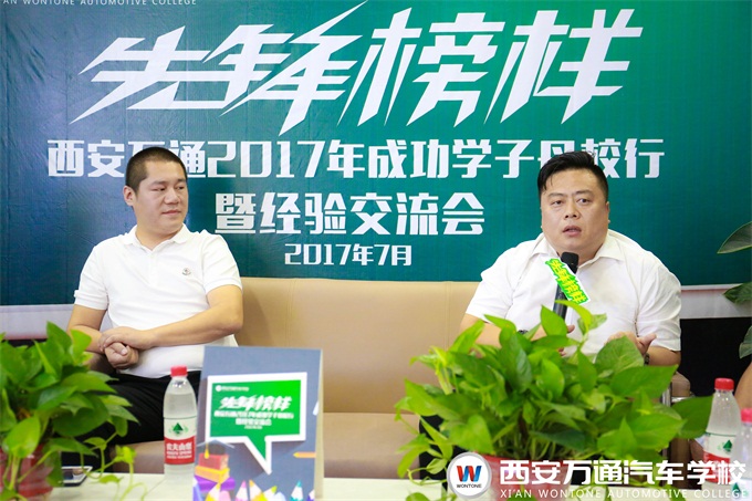 7月28日,西安萬通汽車學(xué)校創(chuàng)業(yè)示范店里正在上著一堂特別的課程,同學(xué)們都全神貫注、聚精會(huì)神的聽著臺(tái)上的“老師”們的授課。這些“老師”們就是西安萬通汽車學(xué)校的成功創(chuàng)業(yè)學(xué)子,他們正以自身的真實(shí)案例向西安萬通的在校學(xué)子們傳授分享創(chuàng)業(yè)奮斗的歷程與經(jīng)驗(yàn),受到了萬通學(xué)子的熱烈歡迎。另外,還有來自知名車企的創(chuàng)業(yè)幫扶導(dǎo)師,他們是每天美車汽車服務(wù)連鎖總經(jīng)理余震和陜西八車道汽車服務(wù)總經(jīng)理潘劍。