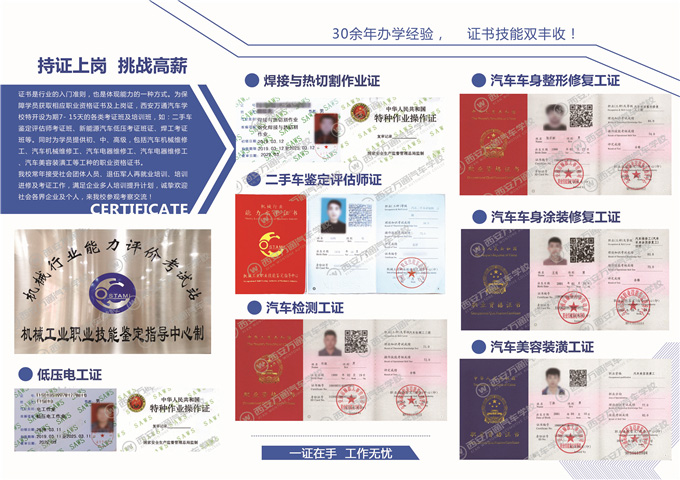 西安萬通汽車學校專業從事汽車教育32年,設有專門的考試、考證服務部門,專業指導在校學生和社會人員進行汽車相關資格證書考試,熟悉職業證書考試中的各種題型和實操內容,通過率高,拿證快,還能助你在汽車行業成就更光明的前途和錢途。