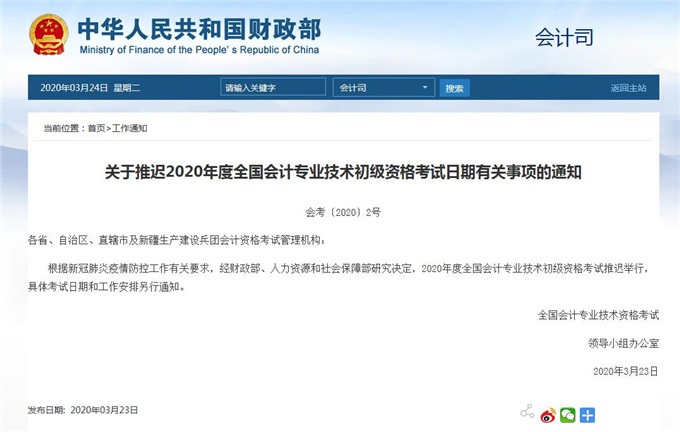 根據(jù)新冠肺炎疫情防控工作有關(guān)要求,3月23日,經(jīng)財(cái)政部、人力資源和社會(huì)保障部研究決定,全國(guó)會(huì)計(jì)專(zhuān)業(yè)技術(shù)資格考試領(lǐng)導(dǎo)小組辦公室發(fā)布通知:2020年度全國(guó)會(huì)計(jì)專(zhuān)業(yè)技術(shù)初級(jí)資格考試推遲舉行,具體考試日期和工作安排另行通知。