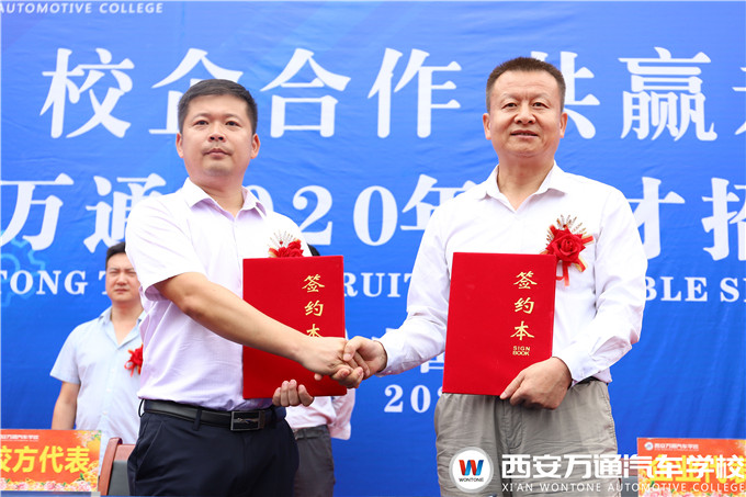 大會第二項,西安萬通汽車學校爨助與優質校企合作單位簽約儀式正式開始,西安優達汽車科技有限公司副總經理羅總和西安大象汽車銷售服務有限公司張總分別與我校簽訂2020年校企合作委培協議,達成校企合作共識,共同助力人才培養。