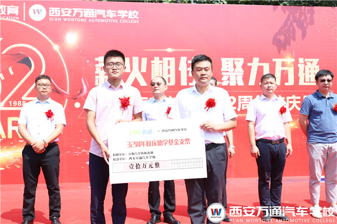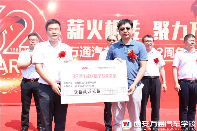 為培養出行業切實所需的職業化、專業化人才,西安萬通也與全國29000余家校企合作單位建立了深厚的校企合作關系。在校慶月啟動儀式上,優質企業代表百援精養汽車服務有限公司陜西區域徐總經理、百順養護陜西區域張經理也分別向我校贊助了巨額校慶助學金,助力萬千學子實現汽車夢想!