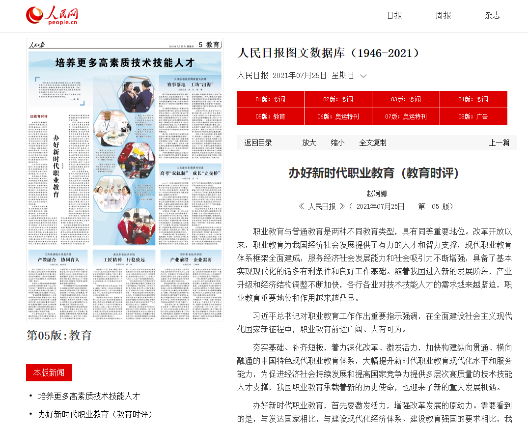 《 人民日報 》第5版刊發“辦好新時代職業教育(教育時評)” ,明確指出職業教育為我國經濟社會發展提供了有力的人才和智力支撐,其重要地位和作用越來越凸顯。辦好新時代的職業教育職業教育必將迎來新的跨越式發展,必將培養更多高素質技術技能人才、能工巧匠、大國工匠,為全面建設社會主義現代化國家、實現中華民族偉大復興的中國夢提供有力人才和技能支撐!