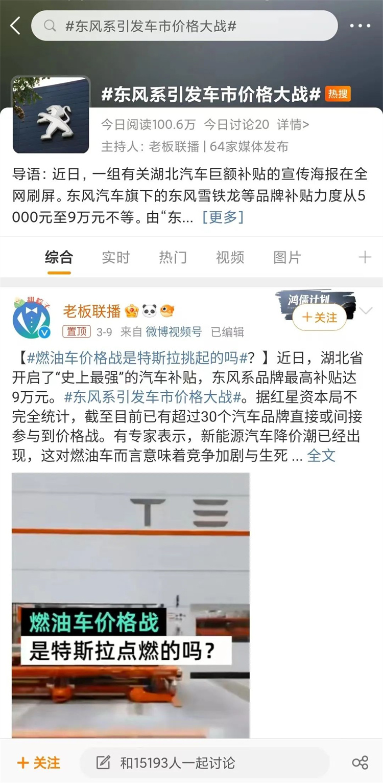01汽車市場“爭奪戰(zhàn)” 一張“湖北史上最強購車優(yōu)惠季開啟”的宣傳海報顯示,東風汽車本輪聯(lián)合補貼力度最高達9萬元,相當于購買新車可享“六折”,隨后汽車價格戰(zhàn)在湖北開始了一場大亂斗,并開始向其他地區(qū)蔓延。 今年1-2月,中國乘用車總共賣出了267.9萬輛,其中燃油車190.9萬輛,77萬輛是新能源汽車。而在去年1-2月份,中國賣出的334萬輛乘用車里,272.3萬輛是燃油車,62.7萬輛是新能源汽車。 新能源汽車并沒有安于逐漸取代燃油車市場現(xiàn)狀,對于燃油車市場的爭奪戰(zhàn),已經(jīng)呈現(xiàn)在了我們眼前。眾所周知,包括比亞迪、特斯拉、長安深藍、理想、蔚來在內(nèi)的各家新勢力正在厲兵秣馬,試圖在中國汽車市場卷出自己的生存空間。